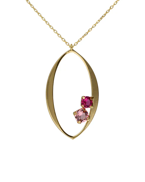 Collar largo con cristales rosas en plata de ley con baño de oro 18K.